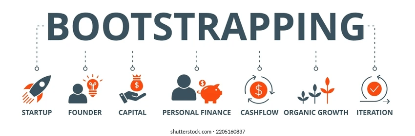 Bootstrapping involves using what you have at your disposal to get yourself where you want to be. Ex: credit cards, personal savings, cycling profits back into the business + keeping control of your business as long as you can.